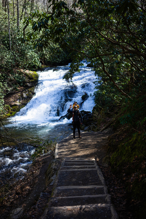 Our first adventure was hiking near Bryson City. We did the Tom Branch, Indian Creek and Juney Whank waterfalls trails. It ended up being 6 miles total and took us about 3 hours with the kids. There was a section in the middle that was pretty tough and we ended up having to take turns carrying Ada (Fritz was already on Ben's back). The trail was well marked, there was only one spot where we got a little confused on where to go. The waterfalls were so great, looking back I wish we would have spent more time viewing them. It got to the point where we wanted to be done and just kind of breezed by the last one.